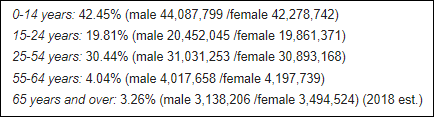 The median age of the Nigerian populace is 18.4 years (Wikipedia / CIA World Factbook 2018 est.[3])