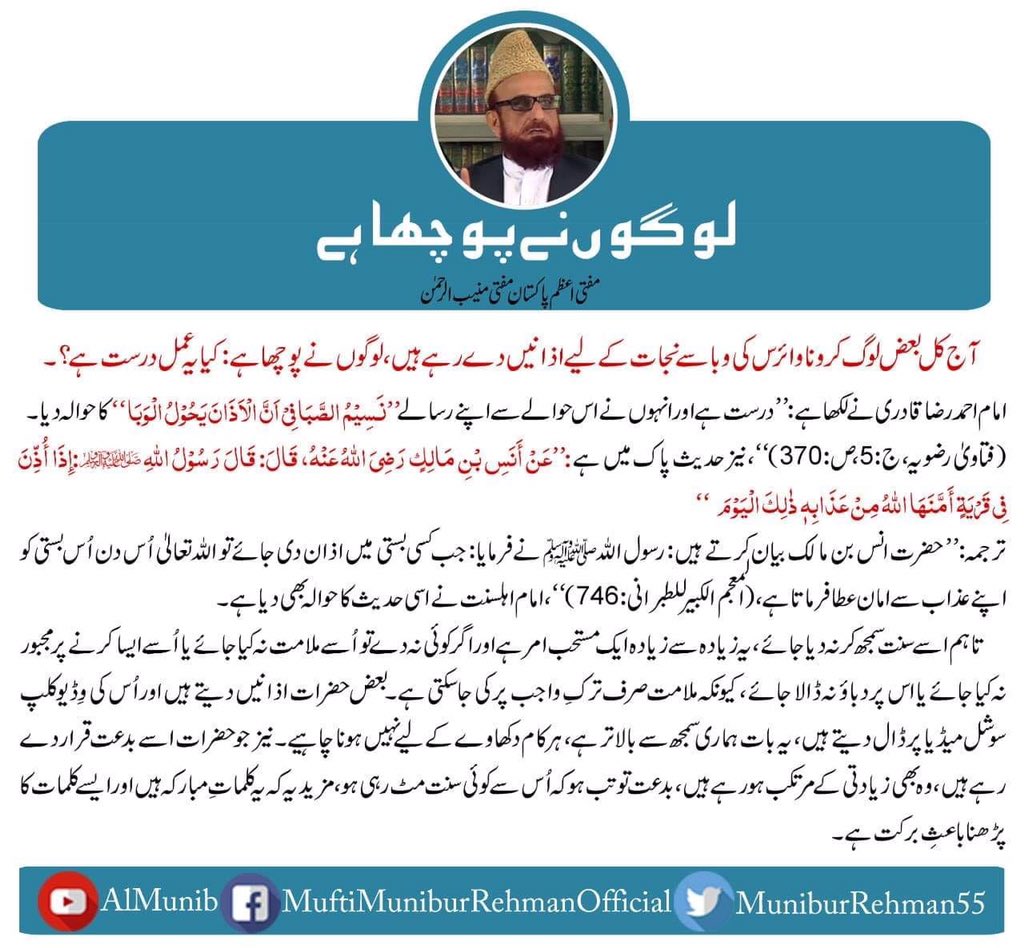 لہذا مسلمانوں کو چاہئے کہ جہاں دیگر تدابیر اختیار کر رہے ہیں وہاں اپنے اپنے گھروں میں ضرور اذانیں دیں، گھر میں جب چاہیں اذان دے سکتے ہیں کوئی وقت خاص نہیں ہے