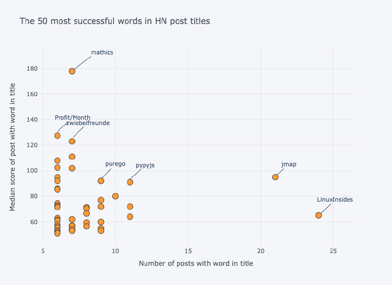 For example, the word “zwiebelfreunde” appeared in 7 titles and the median score of all those submissions was 121 points. Impressive.