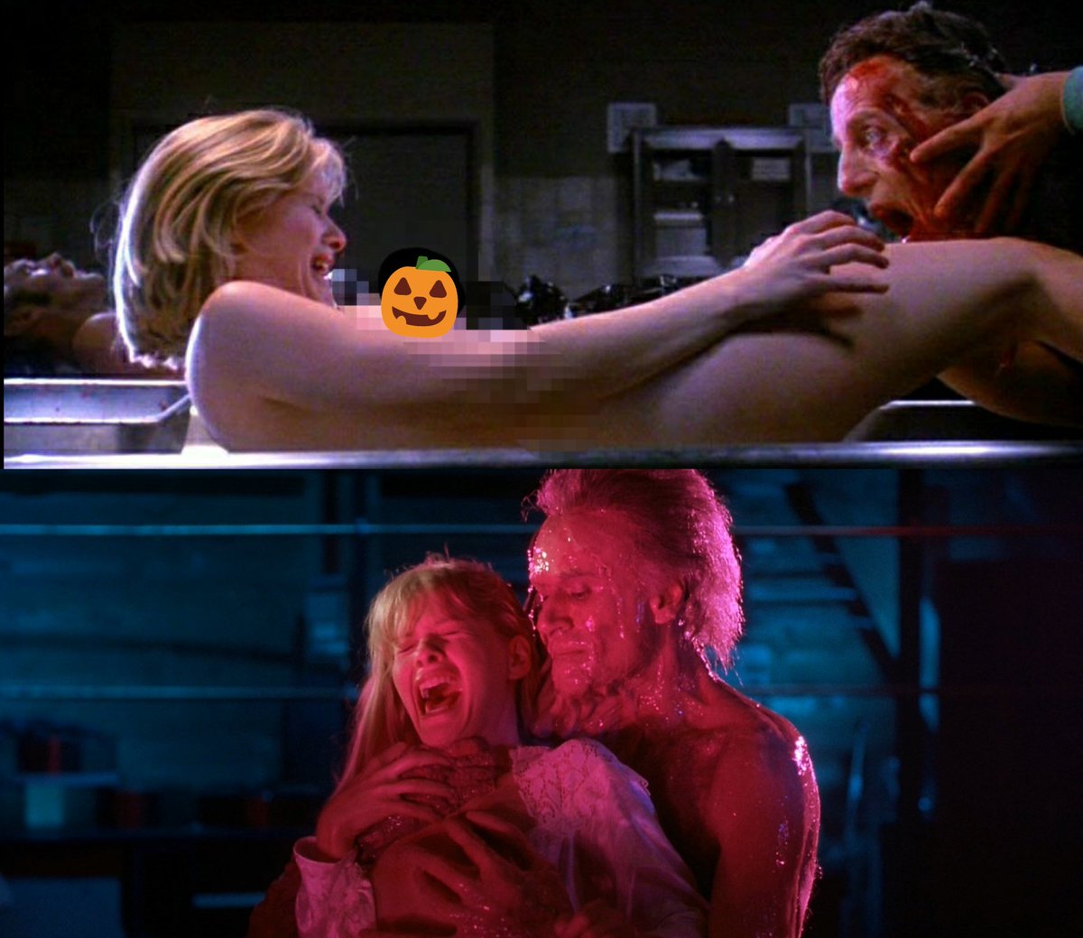 Barbara Crampton era la musa de Stuart Gordon, repitió por las mismas razones que Combs. La escena del hospital recuerda bastante a RE-ANIMATOR. Esa masturbación la copió Jonathan Demme para SILENCE OF THE LAMBS, o qué. #FromBeyondHorrorLosers