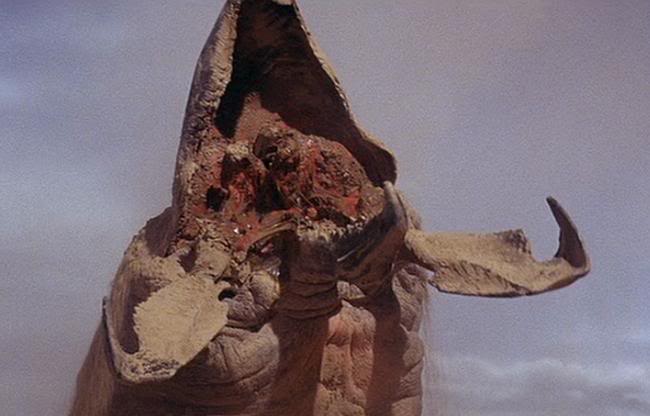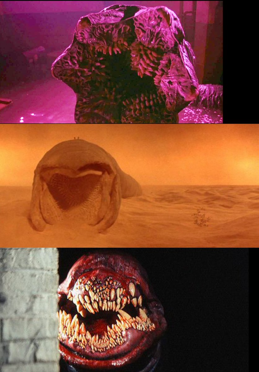 La lombriz (o lo que demonios sea eso) dentada, un monstruo bastante común en el cine de los 80, lo teníamos cerca en THE DEADLY SPAWN (1983) y DUNE (1984) de David Lynch. Más tarde otros ejemplos como los Graboides de TREMORS o el Demorgon de #StrangerThings lo que nos lleva a..