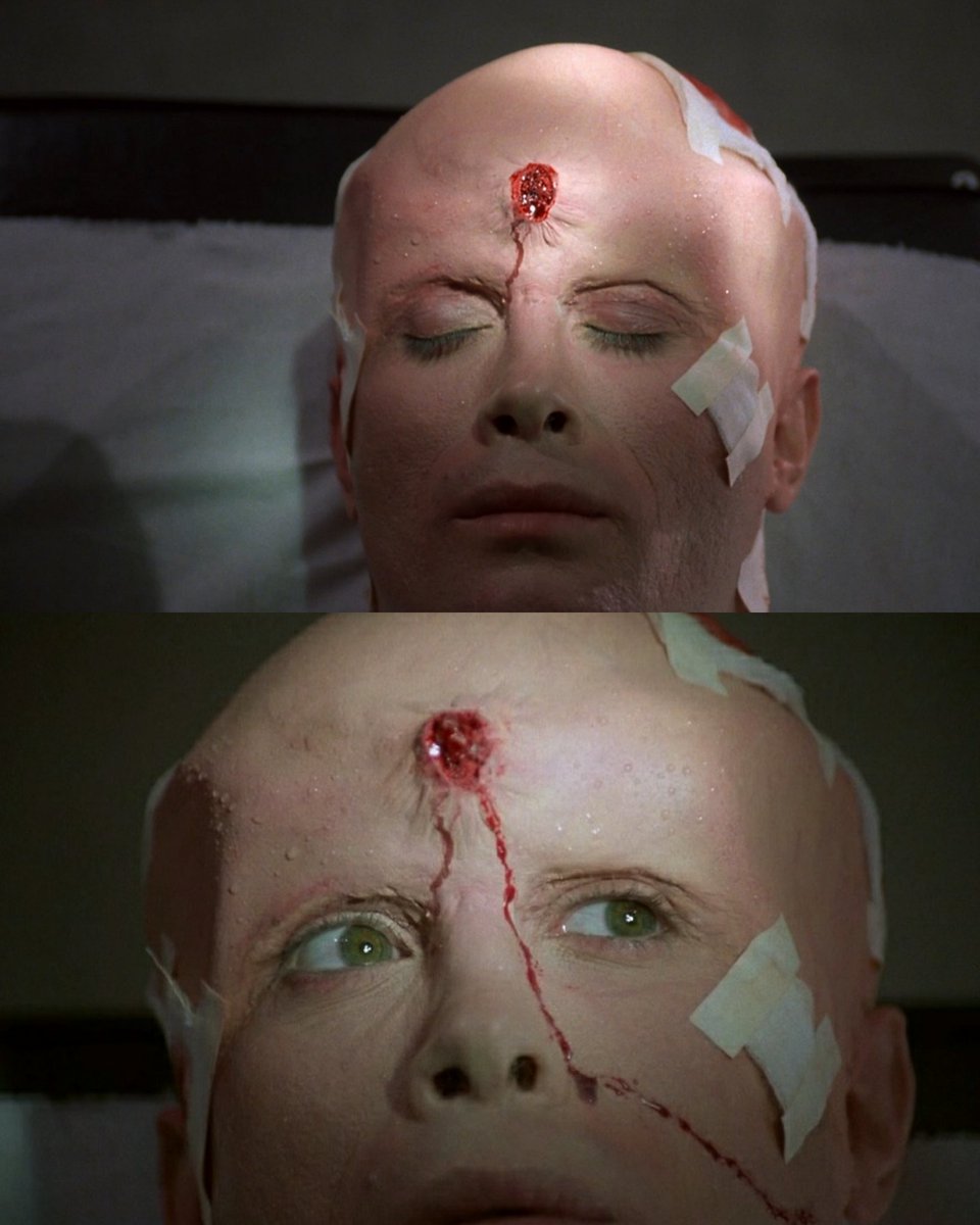 El tramo del hospital acaba transformando a Jeffrey Combs en medio zombie comiendo cerebros como en RETURN OF THE LIVING DEAD, probablemente los momentos más similares a RE-ANIMATOR. Esta escena de la succión del ojo fue cortada por la MPAA. #FromBeyondHorrorLosers