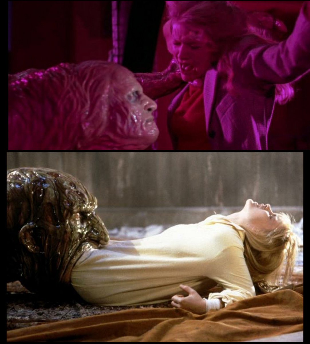El momento erotómano clásico en la dupla Lovecraft. Las manos extendidas como penes y el magreo a Crampton recuerda al sadismo del mítico momento de la cabeza en RE-ANIMATOR (1985) con la misma actriz. #FromBeyondReanimator