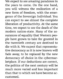 The book was certainly a inspirational tome for much individualist cypherpunk thought in the 2000s. But what did it concretely predict? And with 2020 hindsight (heh), what was right and what wrong?