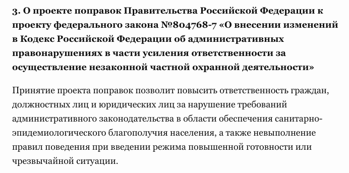 That bill was introduced by the Government into the State Duma on 2 October 2019. Its subject? Increasing administrative punishment for carrying out illegal private security activities – nothing whatsoever to do with breaking quarantine rules. 6/? sozd.duma.gov.ru/bill/804768-7