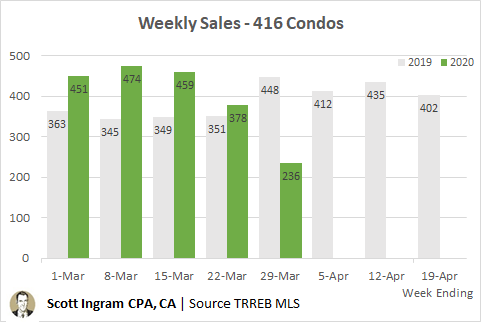 Here are absolute numbers for 416 condo sales by week (Monday to Sunday). Same pattern.