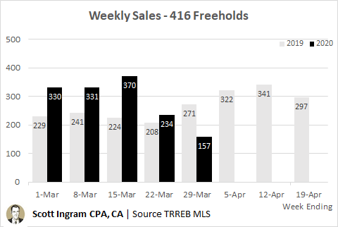 Here are absolute numbers for 416 freeholds. Ontario declared #StateOfEmergency on March 17, so two days into week ended March 22 (Sunday). Week just ended was first full week under SOE. /2