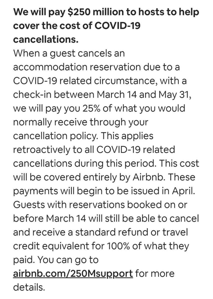Some #Airbnb measures to help out its hosts. It's not 25% of the reservation revenue, just of your cancellation fee. As I interpret, $400 booking, your policy refunds 50% ($200), you get $50. (Everything being 100% refunded now so better than nothing.) /1