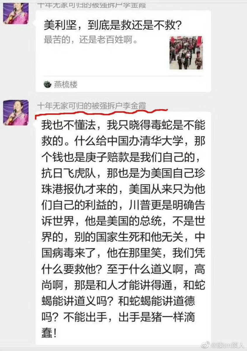 近日一名ID为“十年无家可归的被强拆户李金霞” 的微信聊天记录热传微博。其着重讨论了疫情当下中美关系问题