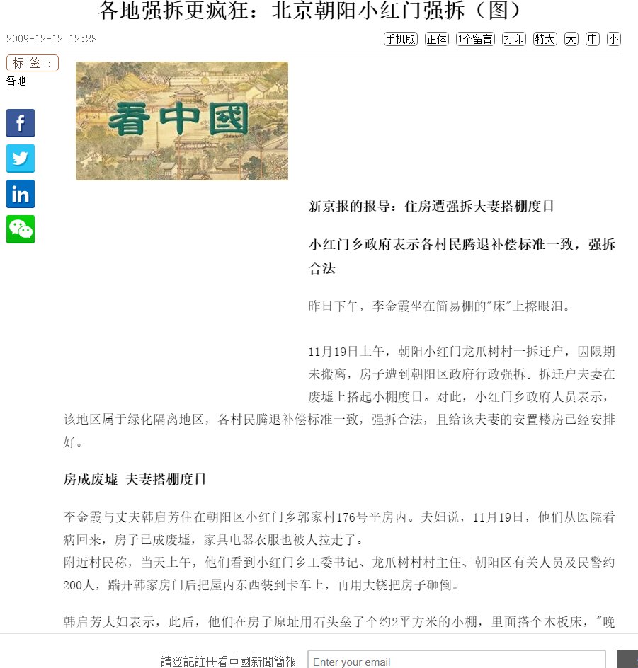 新京报的报导:住房遭强拆夫妻搭棚度日【选摘】