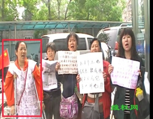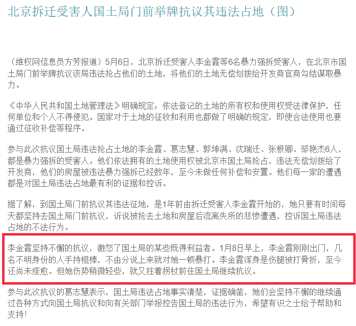 图1是强拆现场,图二报道李金霞被打骨折,拄拐抗议。图三图四为李金霞拄拐抗议照片。 ImageImageImageImage