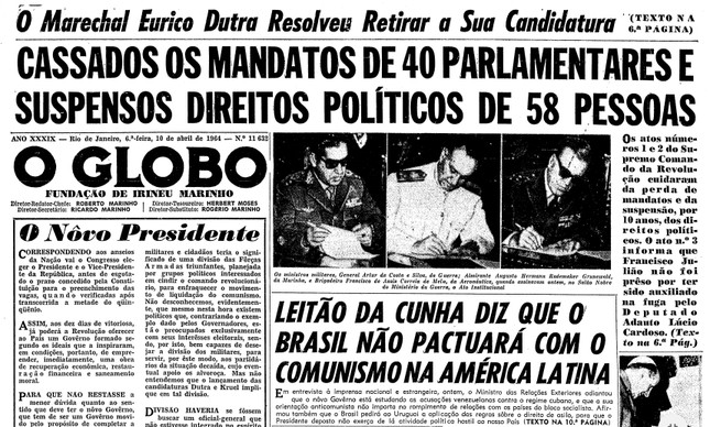 9/04/1964 – O Ato Institucional Nr.1 é decretado, conferindo poderes para cassar mandatos e suspender direitos políticos. Nesta data, 100 pessoas tiveram os seus direitos políticos suspensos (sim, a notícia da imagem está errada). 40 parlamentares tiveram seus mandatos cassados.