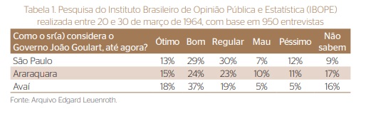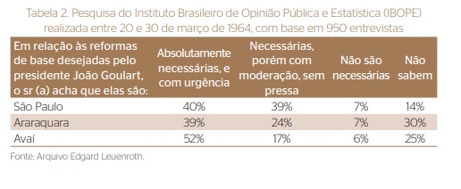Segundo o historiador Luiz Antônio Dias - especialista em análise de pesquisas de opinião no período -, pouco antes do golpe, a proposta de reforma agrária obteve apoio superior a 70% em muitas capitais. Ou seja, Jango não discursava para o vazio. Suas propostas eram populares.