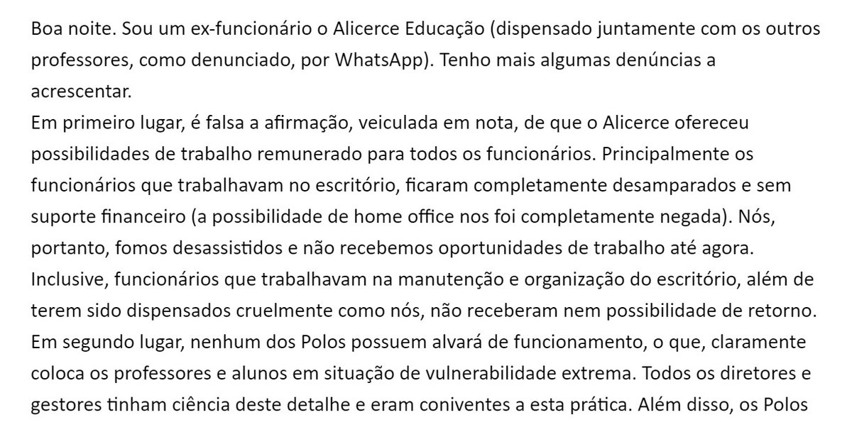 "É falsa a afirmação, veiculada em nota [do CEO da empresa], de que o Alicerce ofereceu possibilidades de trabalho remunerado para todos os funcionários. Principalmente os funcionários que trabalhavam no escritório, ficaram completamente desamparados e sem suporte financeiro."