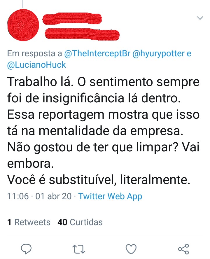 "Trabalho lá. O sentimento sempre foi de insignificância lá dentro. Essa reportagem mostra que isso tá na mentalidade da empresa. Não gostou de ter que limpar? Vai embora. Você é substituível, literalmente."