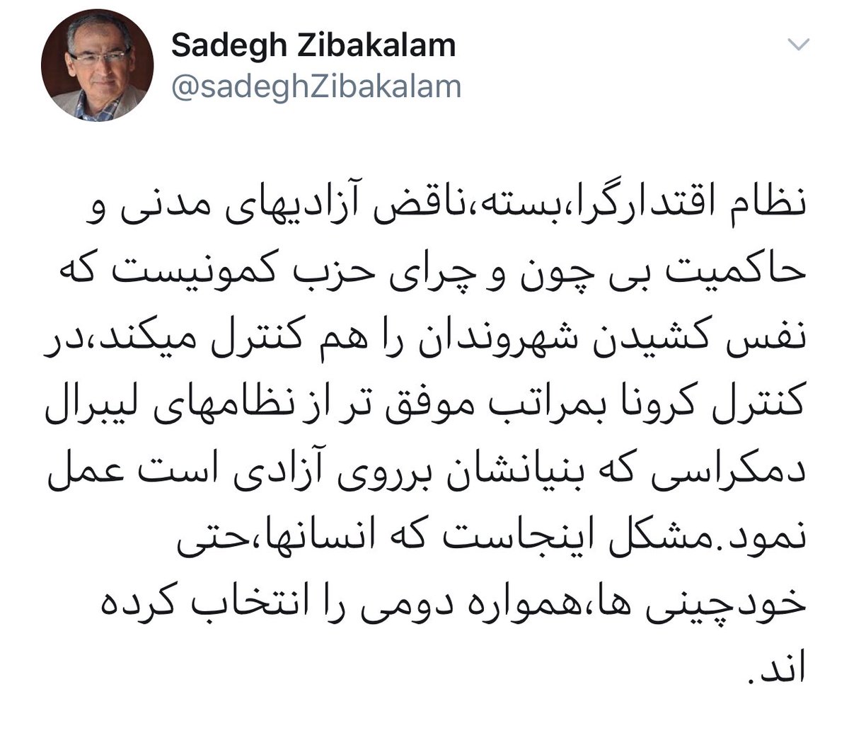 سه کشوری که در مقابل با بیماری بسیار موفق عمل کردند، حکومتهای دموکراتیک بودند: کرهجنوبی، سنگاپور و تایوان.