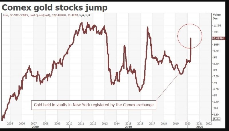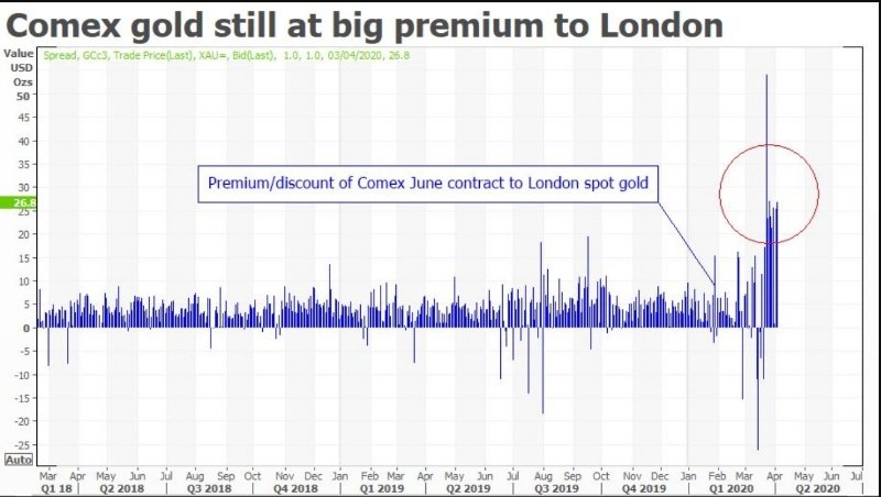 Külçe #altına olan talebin, New York vadeli vs. Londra spot (fiziki) fiyat farkını rekora uçurduğunu raporlamıştık. Reuters, Nisan vadeli "fiziki teslim talebinin" katlandığını ancak arbitraj nedeniyle New York stoklarına da giriş olduğunu haber yapmış: