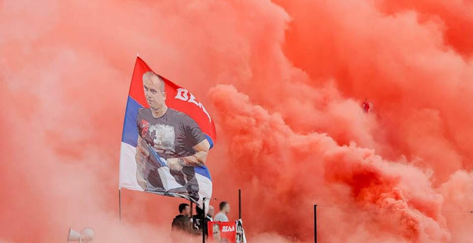 Fotoğraf: Kızılyıldız-Partizan derbisindeki deplasman tribünü. Ortada Grobari, (bize göre) solda Zabranjeni (Yasaklılar) ve ekrana en yakın yerde BW Angels.