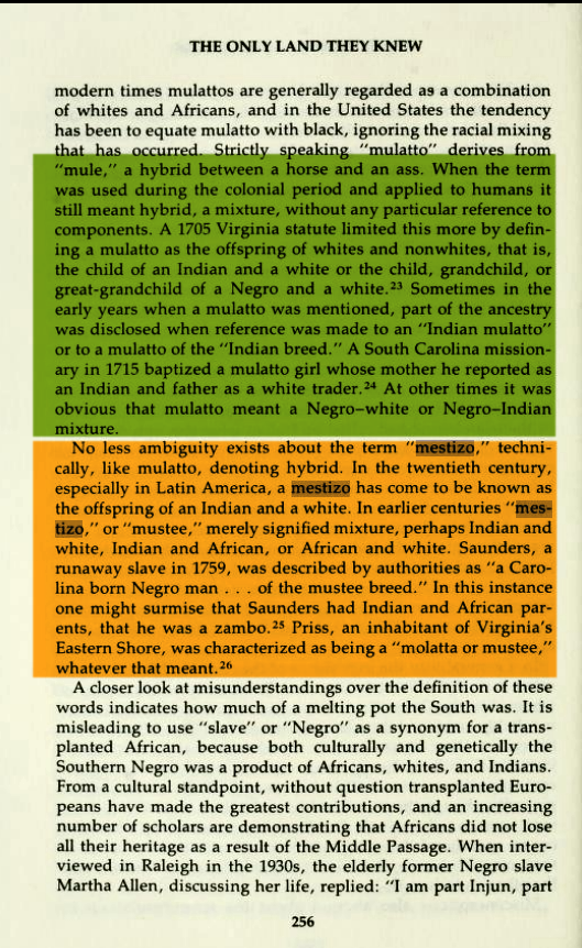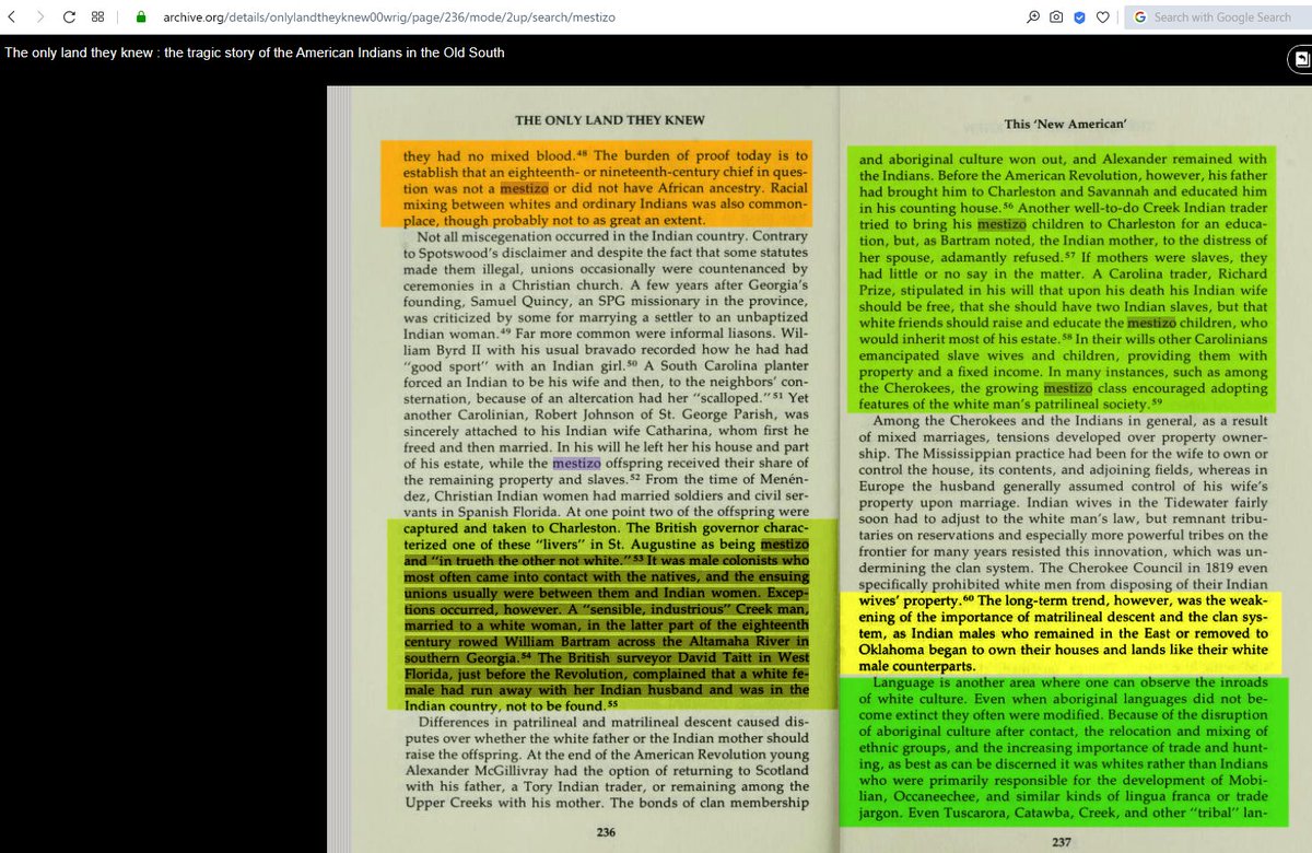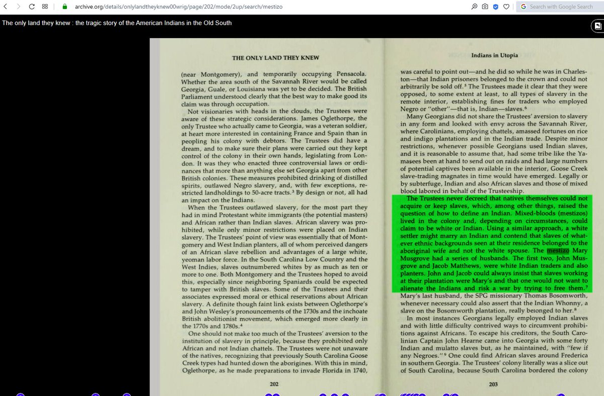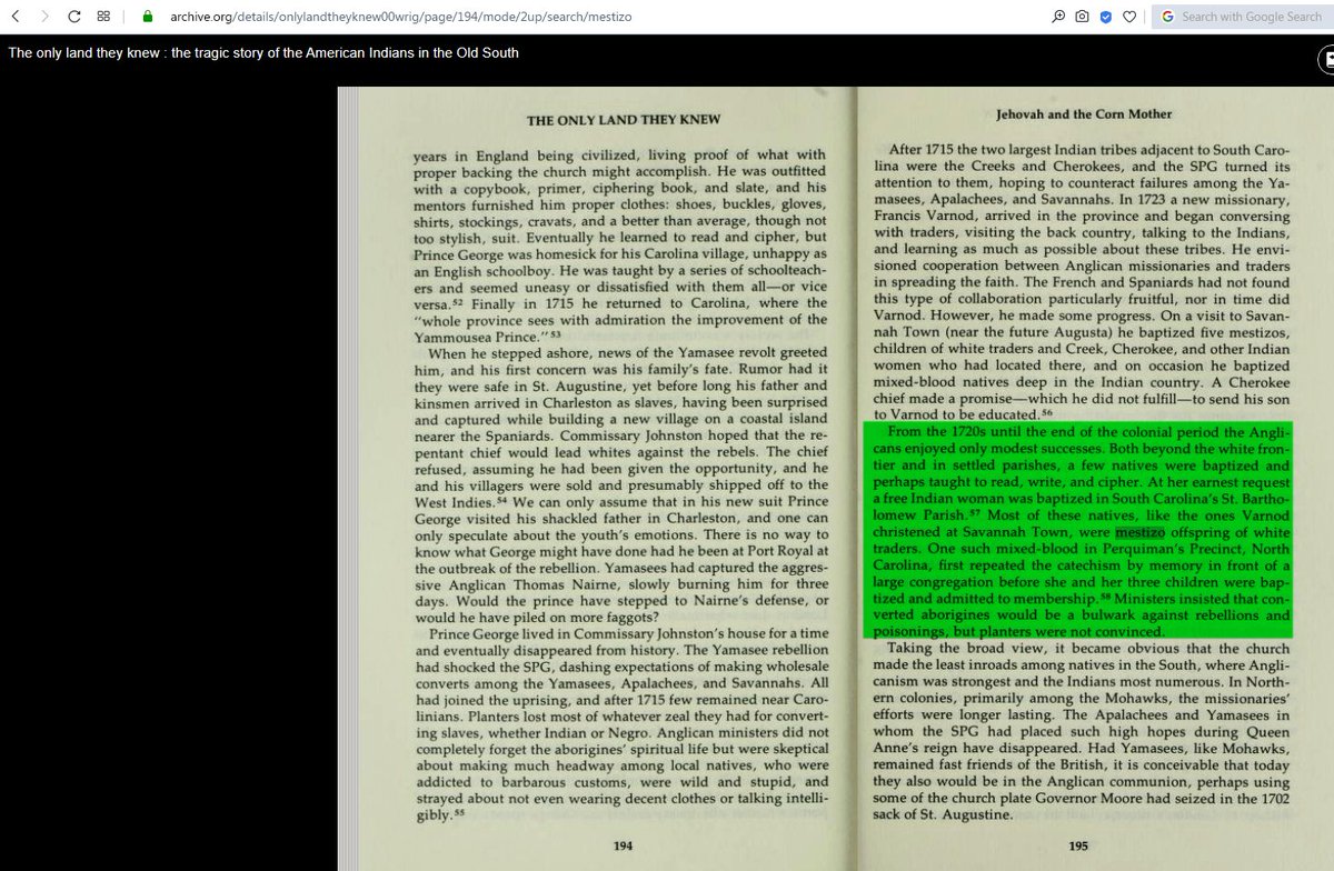 The only land they knew-the tragic story of the American Indians in the Old South-by Wright, J. Leitch 1981- Mixed-bloods-mestizos-lived in the colony and depending on circumstances could claim to be white or Indian.