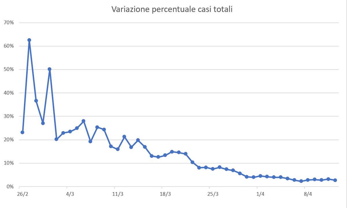 I casi stanno aumentando in media del 30% su sette giorni prima. Oggi l'aumento è del 35%, ieri del 39%. Con questa velocità i casi raddoppiano in due settimane e mezzo.