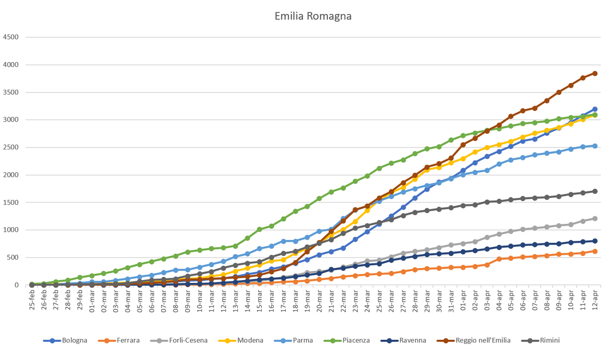 #EmiliaRomagna. Oggi +2.4% (ieri +2.7%). Reggio Emilia +2,2%, Bologna +4%, Piacenza +1,2% e Modena +2,5%. Rimini +1,7%, Ravenna +1,5%, Parma +0,8%, Ferrara +6,2% e Forlì-Cesena +4,1%.