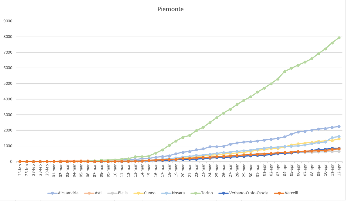 #Piemonte. Oggi +4.1% (ieri +6.6%). Torino quasi a ottomila con un +3,3%. Alessandria +2,6%, Novara +4,2% e Cuneo +8,3%. VCO +0,7%, Vercelli +3,5%, Asti +4,6% e Biella +1,4%.