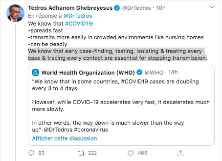 4⃣Pile au moment de #Macron20h, l'Organisation mondiale de la santé (#OMS) insistait sur l'importance de tester massivement "la détection précoce des cas, les tests, l'isolement (...) et la recherche de chaque contact sont essentiels pour arrêter la pandémie.