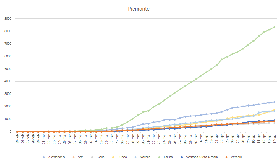 #Piemonte. Oggi +3.2% (ieri +2.8%). Torino +2,6% e Alessandria +2,2%. Cuneo +8,7% (!), Novara +1,6%, Vercelli +1,1%, VCO +1,9%. Asti +9,5% e Biella +3,4%.
