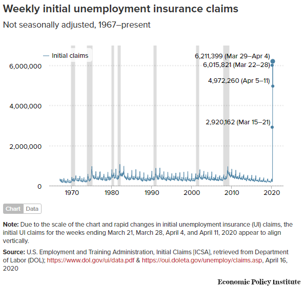 The (not-seasonally-adjusted) 20.1 million unemployment insurance claims filed in the last four weeks works out to almost three-quarters of a million claims EVERY DAY. It’s more than a 2200% increase over the pre-virus period. 4/