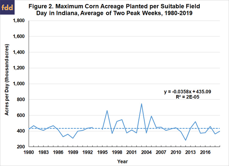 2. We have to be able to plant the Corn Belt faster now than in the past with all those huge planters, right? Wrong. This shows number of corn acres planted in Illinois per suitable field day during two peak weeks of planting progress. Virtually no trend back to 1980.