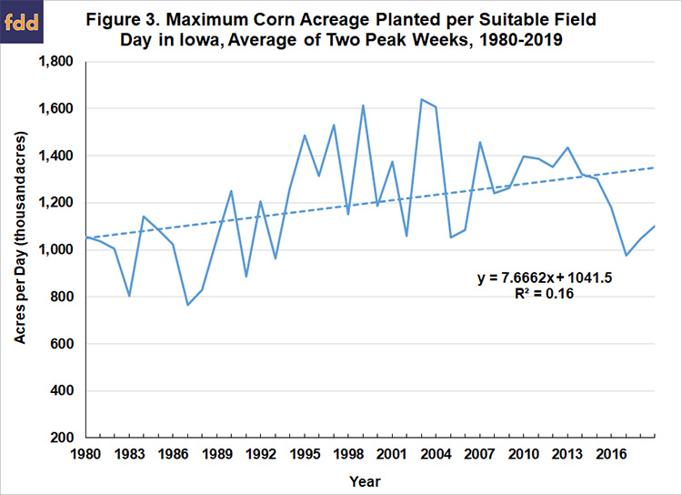 4. Iowa data a little funkier, but same overall message. Little if any evidence that we can cover more acres planting per suitable field day in 2020 than we could in 1980.