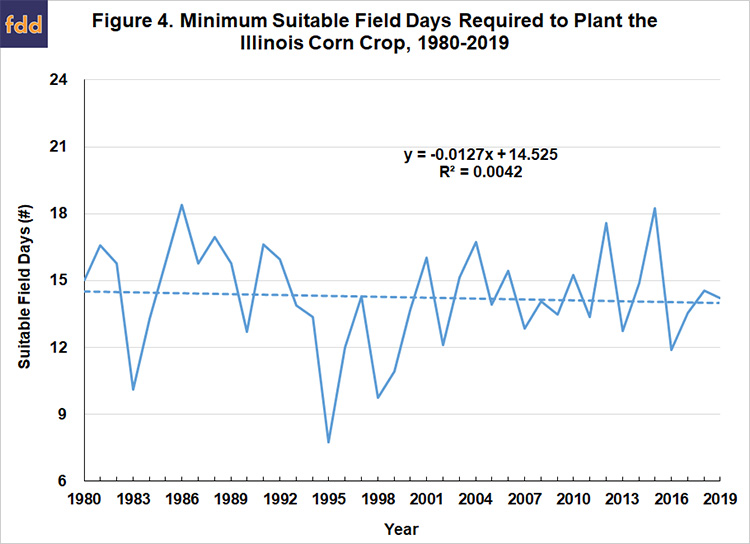 5. A key implication is that it takes a minimum of 14 suitable field days to plant the US corn crop. Note that is the minimum. Usual variation in weather and field conditions means that it typically takes more days.