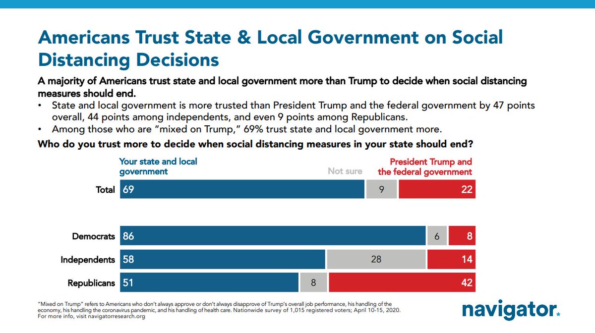Landslide 69% trust state/local gov't with that decision vs. 22% for Trump. Majority of Republicans even trust state/local gov't.