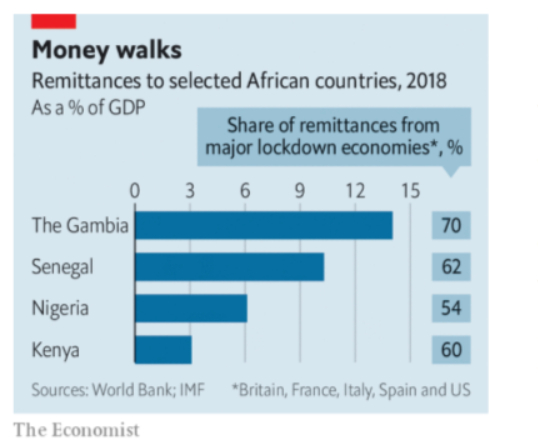 In Lesotho they equal 16% of GDP, in Senegal 10% and even in Nigeria, Africa's biggest economy, 6%. But huge chunks of remittances come from places now in severe #lockdowns