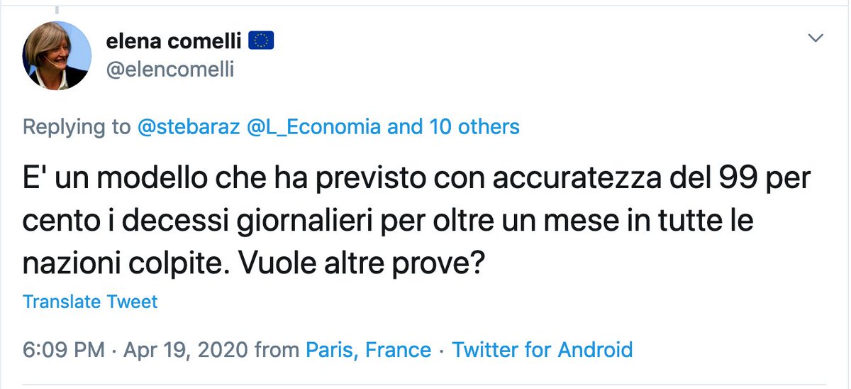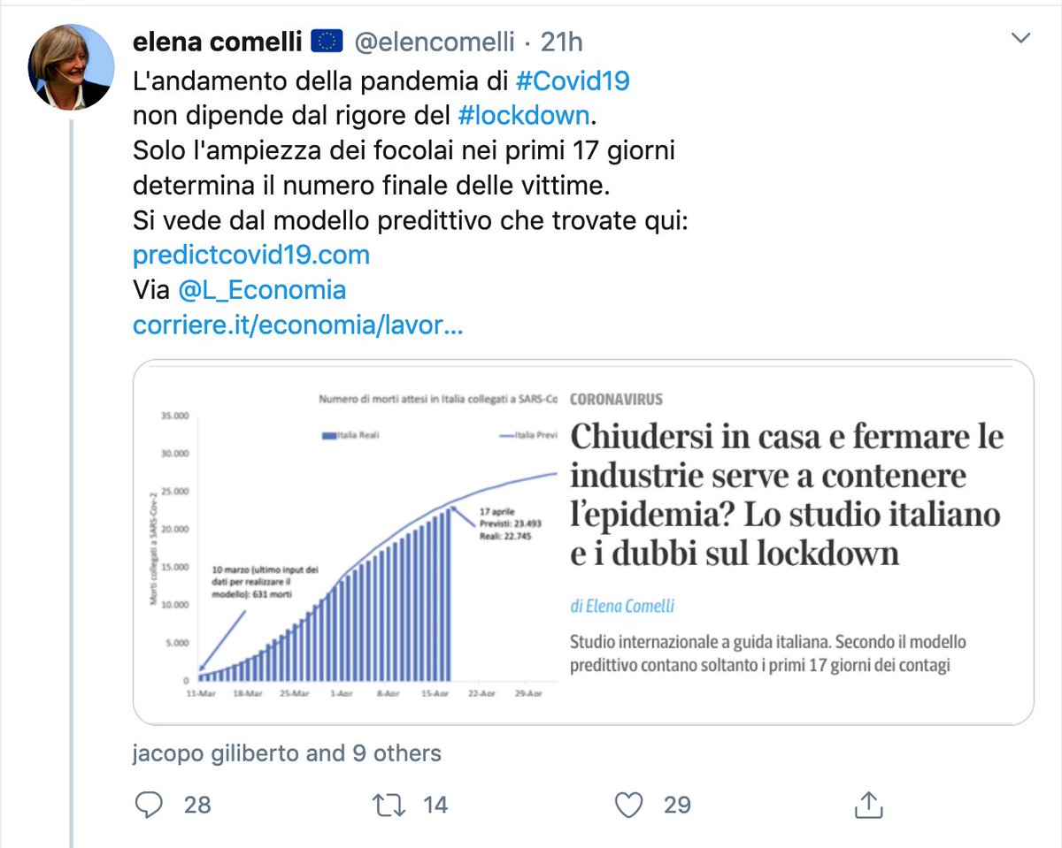 "I numeri sembrano quasi magici: è il 10 marzo, in Italia si registrano 631 morti e il modello prevede, ad esempio, per il 18 aprile 23.873 morti, indipendentemente dalle misure restrittive".