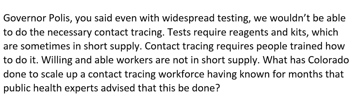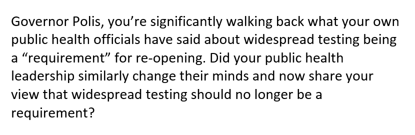 State health experts say widespread testing is a requirement to re-opening safely. And they've said we're not there yet. If I'm allowed to ask Polis a question, I'll be asking whether he believes we'll have said testing seven days from now, or if he'll re-open without it.
