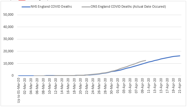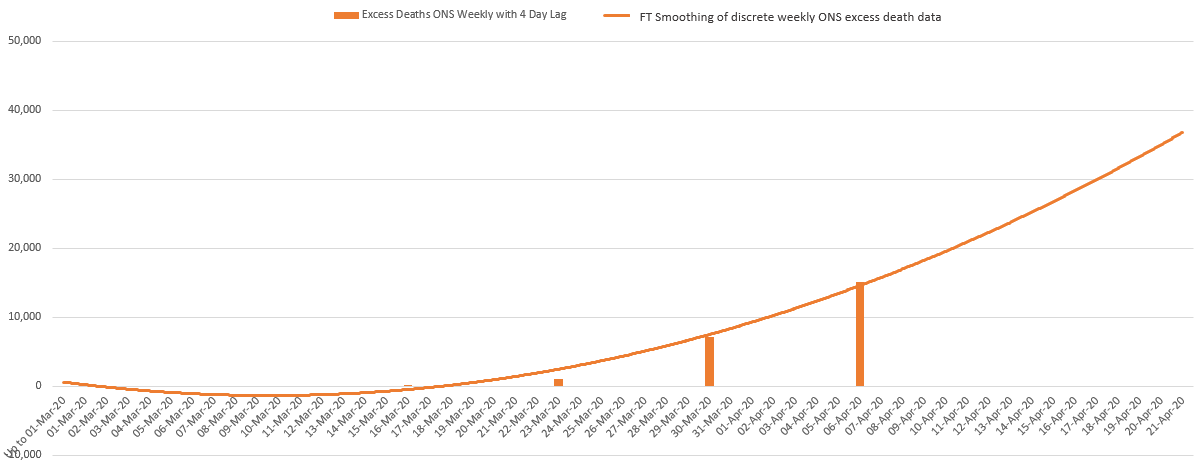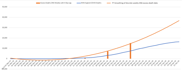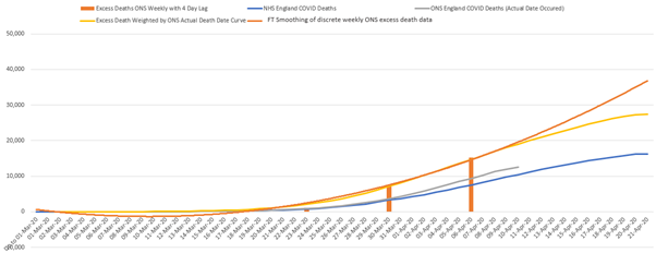 They then compare the excess ONS deaths figure with the NHS hospital death data for the same day (including 4 day lag) and note the difference.