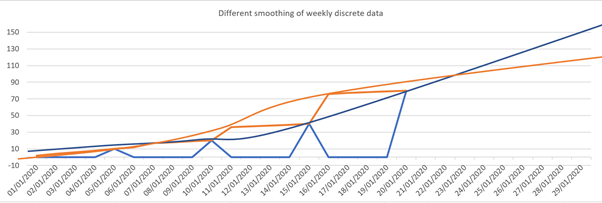 However, I would argue this is misleading, as the actual days that deaths occurred between those peaks can affect the daily trend significantly.