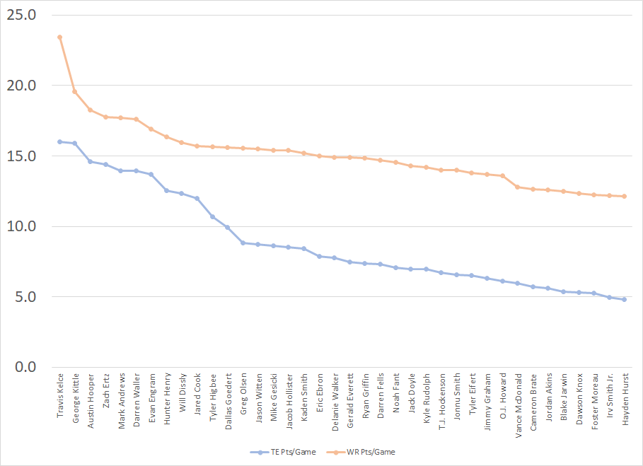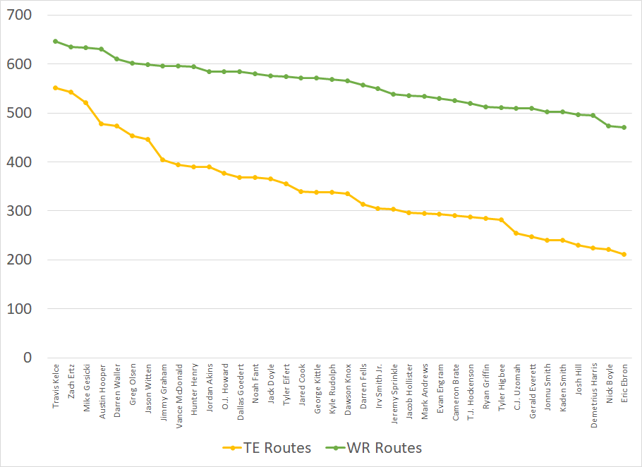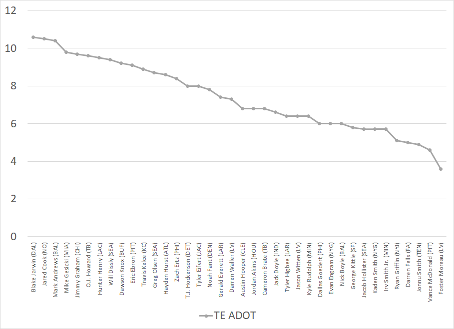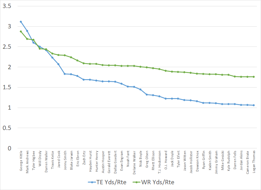 (Notes: data collected from PFF and PFRef, only TEs with more than 25 targets included)
