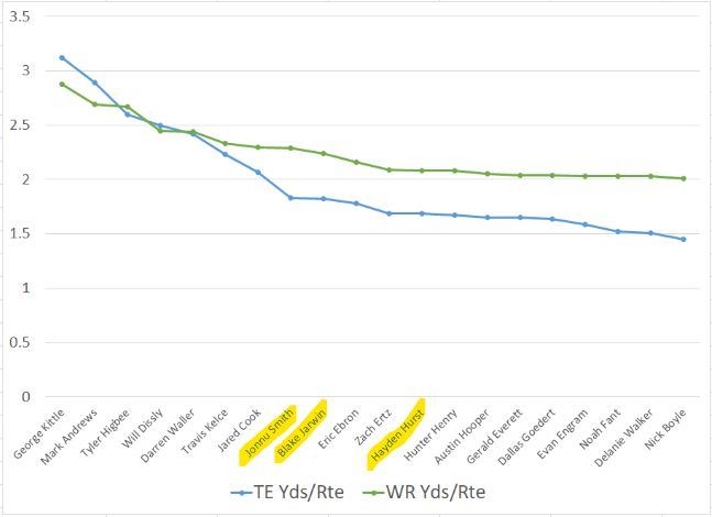 Jarwin and Hurst are early in their careers and suddenly have wide open paths to volume. Upticks in efficiency could lead to big things for #FantasyFootball. Smith is interesting too, but Anthony Firkser remains in a PT downfield role.