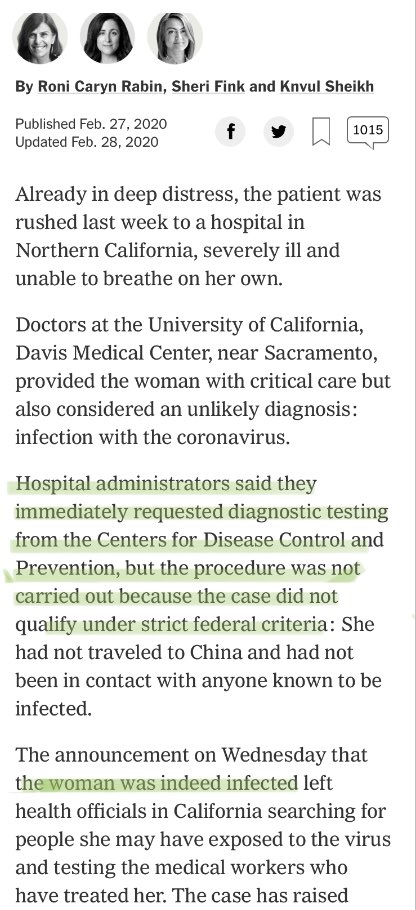 Feb. 27: “Officials are bracing for a larger outbreak in Northern California. “There’s almost assuredly going to be a significant number of people testing positive,” said Dr. Peter L. Beilenson, the director of Sacramento County’s Dept of Health Services.” nytimes.com/2020/02/27/hea…