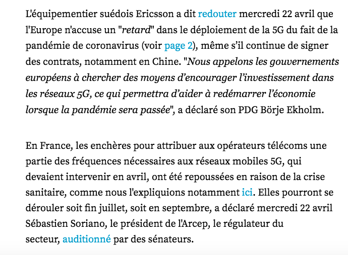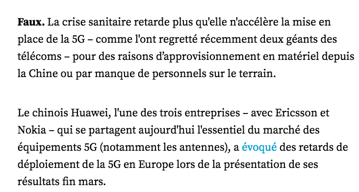 "Pendant que nous sommes confinés dans nos camps de concentration (...), les gouvernements ont donné les pleins pouvoirs aux compagnies de téléphonie mobile, qui ont reçu l’autorisation de déployer à très grande vitesse les réseaux de #5G", assure-t-il. C’est FAUX ❌ [4/7]