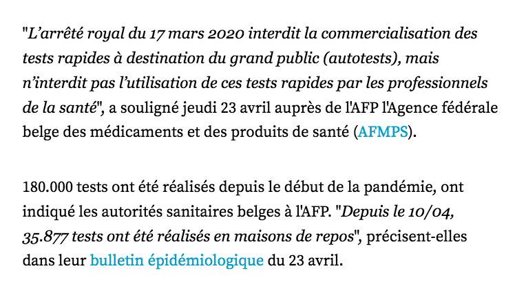 "La ministre de la Santé belge, fin mars, a interdit que l’on fasse des tests pour détecter qui était porteur de coronavirus et qui ne l’était pas, Si ça, ce n’est pas criminel..." C’est FAUX ❌ [5/7]