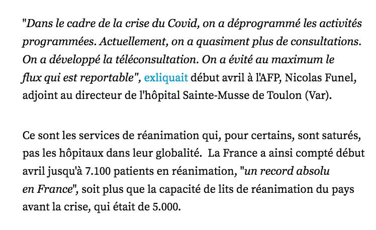 "Je reçois de plus en plus d’informations d’hôpitaux qui sont à moitié sinon à trois quart vides, mais les médias continuent à nous faire croire que les hôpitaux sont complètement débordés". C’est TROMPEUR ⚠️ (comme nous l’expliquions déjà ici ➡️ u.afp.com/3pnM) [6/7]