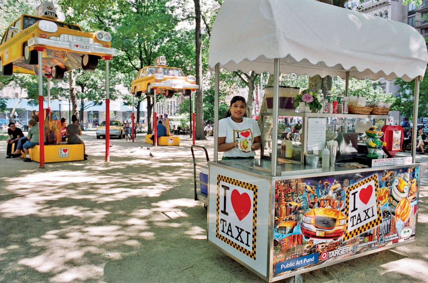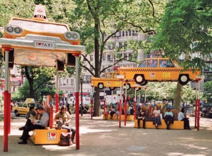 21/ En el 2001, el Ayuntamiento de NYC instaló unas exposiciones de arte contemporáneo en el Madison Square Park. Entre otras, la del tailandés Navin Rawanchaikul, que llamó “I love taxi”. Incluía libros, tiendas, bancos, un café taxi y un puesto de comida de perritos calientes.