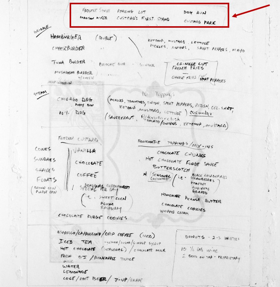 24/ Danny se sentó con Garutti, y juntos esbozaron el concepto y el menú del quiosco en una simple servilleta. Los posibles nombres podían verse en la cabecera de la misma: Frostee Shake, Madison Miker, Parking Lot, Custard's First Stand, Dog Run, Custard Park…