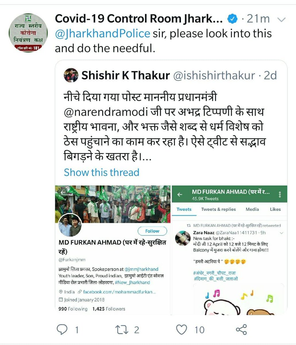 So #Hinduphobia_in_Jharkhand has been taking rounds on twitter. So let me say this, Jhar Pol has become a Stooge of the chief minister. The dept is being used to selectivity target people on twitter (this can be verified by just having a quick look on their Twitter handle) (1)