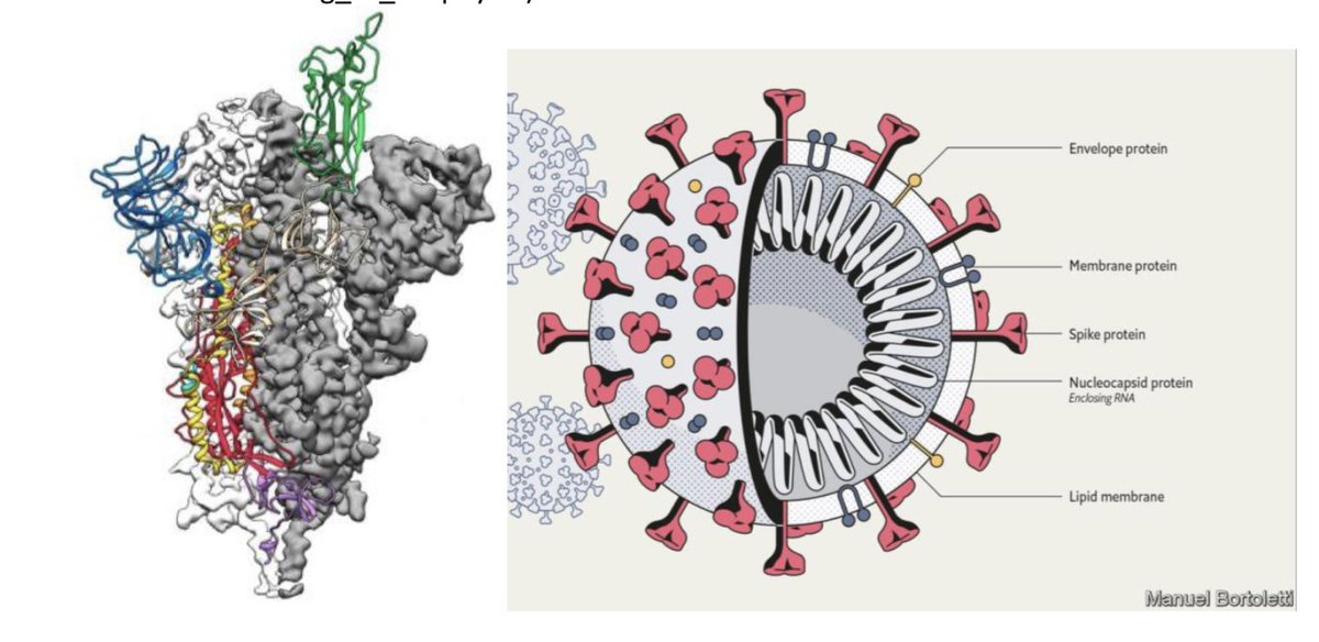 1) here is a schematic of the viral spike protein (left), and a virus with many spike proteins on its surface (right).