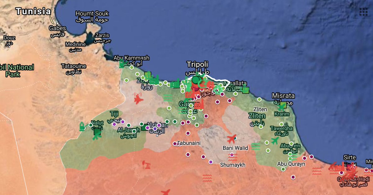 An ugly situation: Haftar can't properly supply his besieged forces and soon he won't be able to evacuate them safely. The Russians are bringing in Syrians and more hardware to try to push but what Libyan would stay and die for a delusional old American? google.com/maps/d/viewer?…