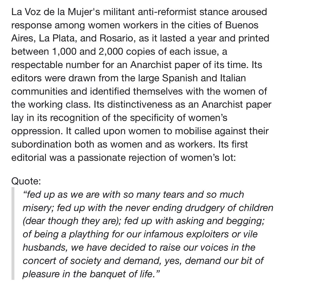 The aim of La Voz de la Mujer is best summed up when one of its supporters signed herself “No God, No Boss, No Husband.”